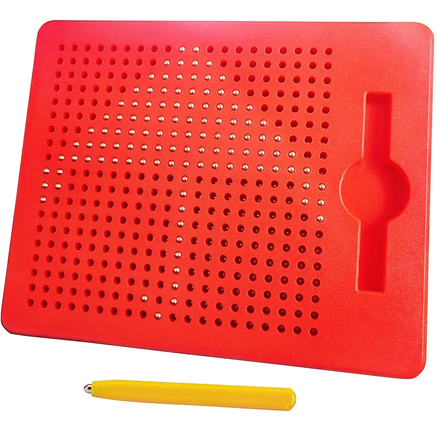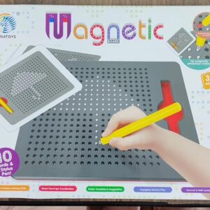 This Magnetic Drawing Board is an interesting and innovative tool where children can create their own unique designs by pulling the beads to the surface with an audible click using the magnetic pen. Each bead stays securely in its own pocket and never falls out. To erase, simply brush your hand or the pen across the surface and watch the design disappear!